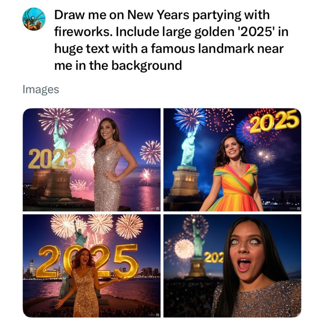 You can see the logic here; it’s the only image is this slate that can be at all understood as creatively inspired. “Wouldn’t it be fun if the fireworks were reflected in cyber-Mariana’s awestruck eyes?” But because the image must also include “famous landmark” and “large golden ‘2025,’” and because this imposter needs to have an expression that says “VERY PARTY FUN” to make up for the clear lack of party surrounding her, the frame is way too wide. The only possible way the fireworks could read as fireworks in the eyes of this not-me is if this were a super-closeup, the eyes taking up most of the frame. But this is a level of creative intimacy Grok is incapable of intuiting. As it is, the jumbling of concepts makes the image read more like this poor woman who isn’t me has been colonized by some kind of manic digital body-snatcher who causes one’s eyes to turn into TV static. Maybe she’ll swallow me whole. Look at me. I am the Mariana now.